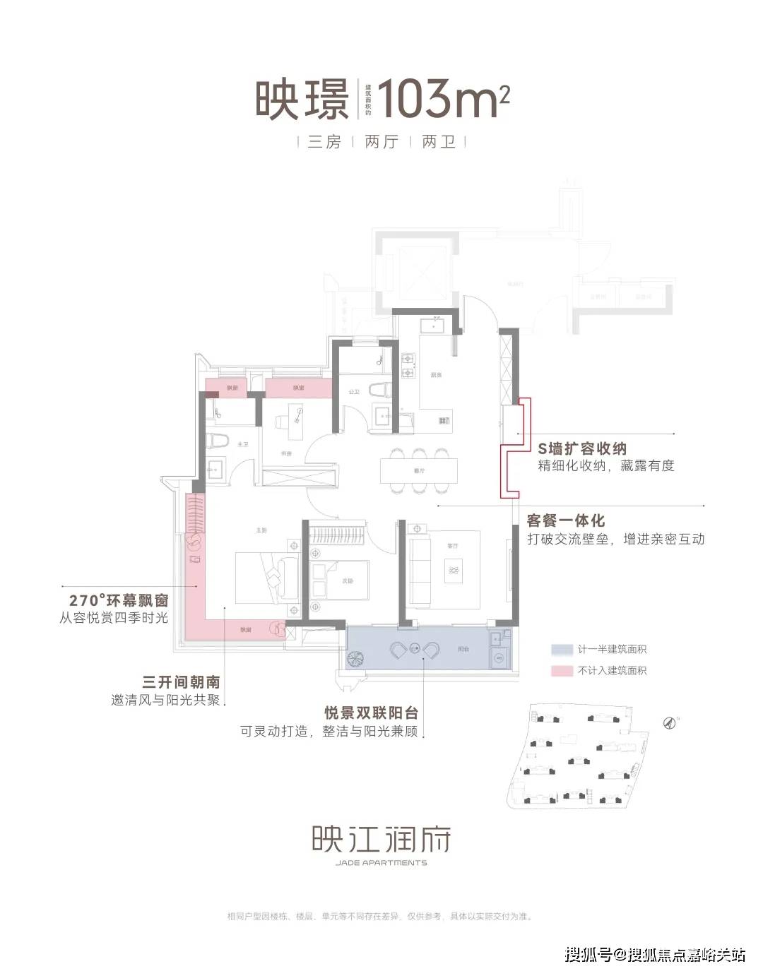 惊艳亮点一:映江润府建面约103㎡边套户型,引入了千万级以上豪宅之中才能够拥有的270°环幕飘窗设计,实现了极致的采光和观景体验。
