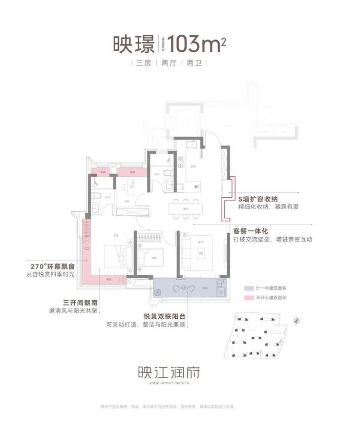 惊艳亮点一:映江润府建面约103㎡边套户型,引入了千万级以上豪宅之中才能够拥有的270°环幕飘窗设计,实现了极致的采光和观景体验。