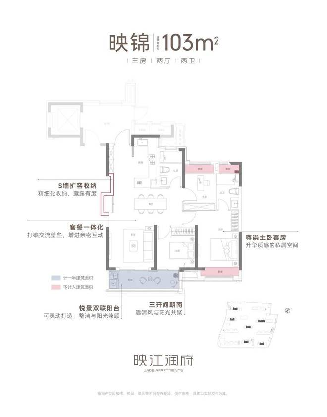 项目采用现代海派建筑风格,外立面以铝板搭配三玻两腔LOW-E玻璃,打造光幕立面,既美观又实用。社区规划“一轴一环五园一带”景观体系,中央景观轴串联五重归家礼序,健身环跑道环绕,五大主题花园满足全龄段休闲需求。主力户型为89-103㎡三房,精准适配刚需与改善家庭。户型设计注重空间利用率与居住舒适度,如89㎡三房做到三开间朝南,得房率约77%;103㎡三房采用LDKG一体化设计,270度环幕飘窗将江景引入室内。精装标准上,项目配备中央空调、地暖、新风系统三大件,厨卫选用一线品牌,部分户型还配备轨道插座、美妆冰箱等贴心设施。华润映江润府(2025华润映江润府)最新消息!-楼盘网站-户型配套华润映江润府(2025华润映江润府)