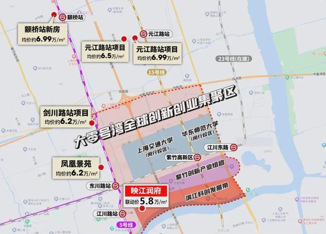 映江润府正是大零号湾全球创新创业集聚区仅有的待售的高品质新房项目,距离老牌5号线步行可达,占位滨江科创发展带,紧邻紫竹创新产业组团,与上海交通大学&华东师范大学一街之隔!